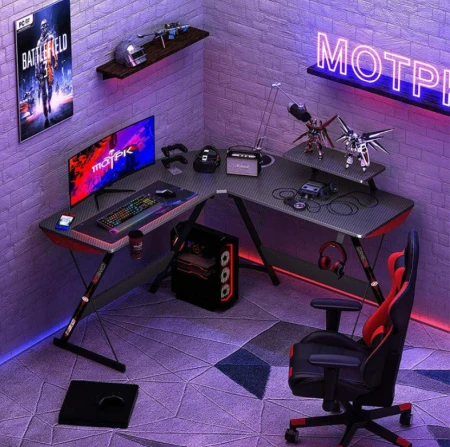 يتميز هذا المكتب بتصميمه على شكل حرف L، مما يتيح لك الاستفادة القصوى من مساحة منزلك أو مكتبك. فهو يندمج بسلاسة في الزوايا، ويملأ الفراغات حول الحائط، موفرًا مساحة أرضية أكبر في الغرفة. كما يأتي مزودًا بحامل شاشة قابل للفصل والتبديل، مما يوفر لك مساحة إضافية للتخزين وممارسة الألعاب.